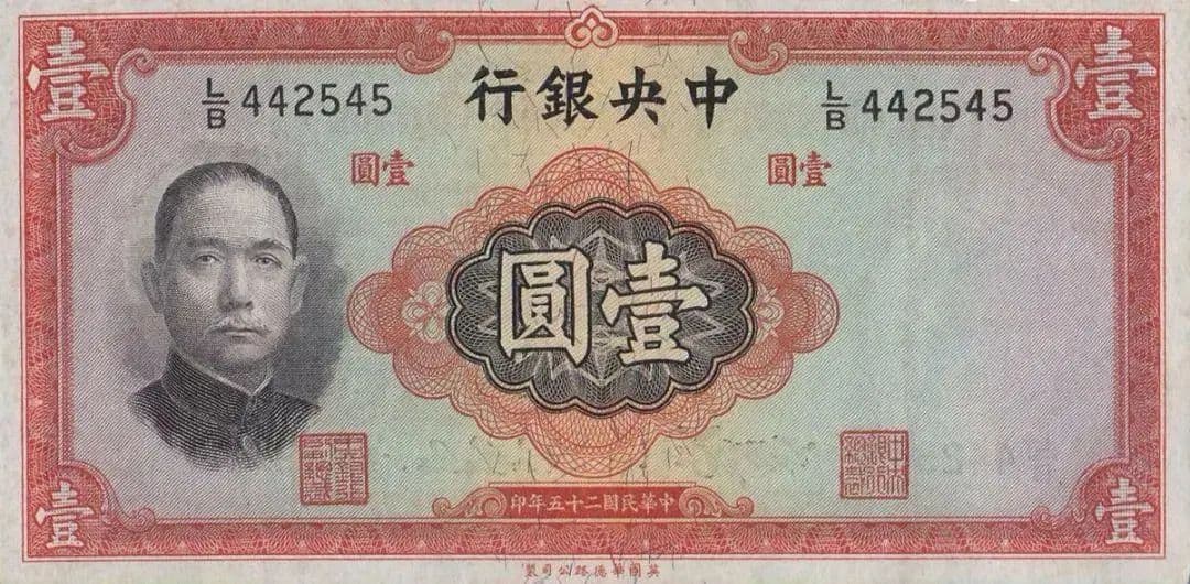 像下面这张1936年印制的壹圆钞票,便是由伦敦华德路公司代印,底部还有该公司的字样。