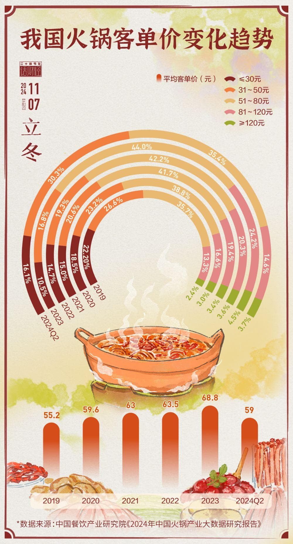 火锅的平均客单价,从2021年的63元,降到了今年上半年的59元。2023年到2024年上半年,50元以下的客单价的火锅占比从27%涨到接近50%。