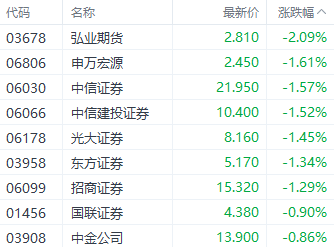 券商股中,申万宏源(06806.HK)、中信建投证券(06066.HK)、光大证券(06178.HK)分别下跌1.57%、1.52%、1.45%。