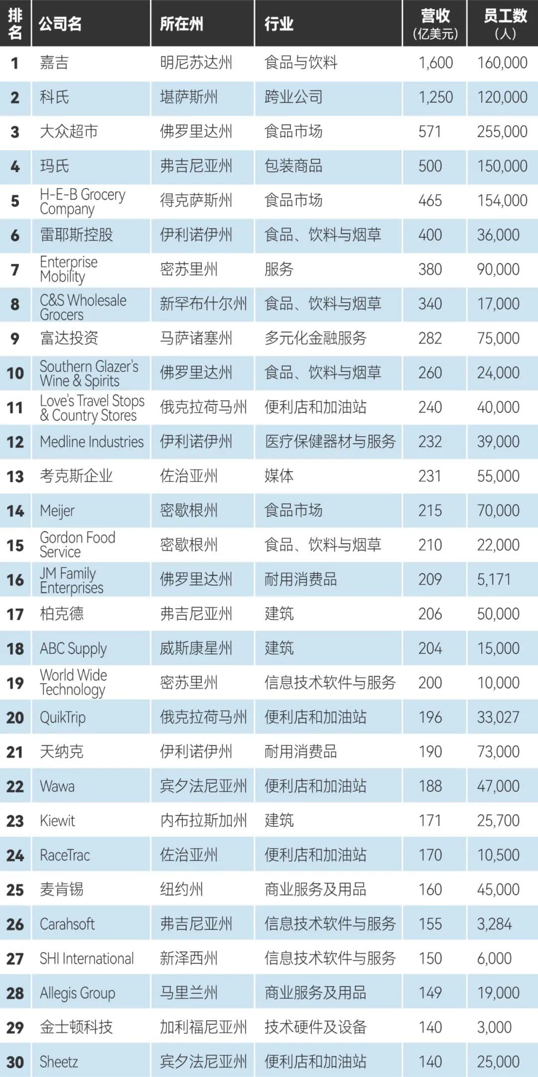我们也没有纳入主要业务为汽车经销或房地产投资和/或管理的公司,但我们纳入了由私募股权公司拥有多数股权的公司,如Medline Industries。在可能的情况下,我们为每家公司列出的营收数据都剔除了其上市子公司的销售额。我们的数据来源包括公司自愿披露的信息、拥有公开交易债务的非上市公司向美国证券交易委员会(SEC)提交的文件,以及《福布斯》研究人员和外部信息来源的估算。