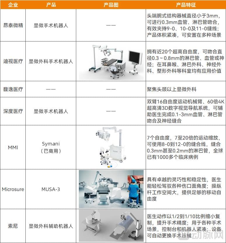 在国内,昂泰微精、迪视医疗、馥逸医疗、深度医疗已布局显微手术机器人产品。其中,2024年,昂泰微精显微手术机器人进入动物实验阶段;迪视医疗显微手术机器人已获得注册检验报告,并完成了动物实验,正在准备人体临床试验。