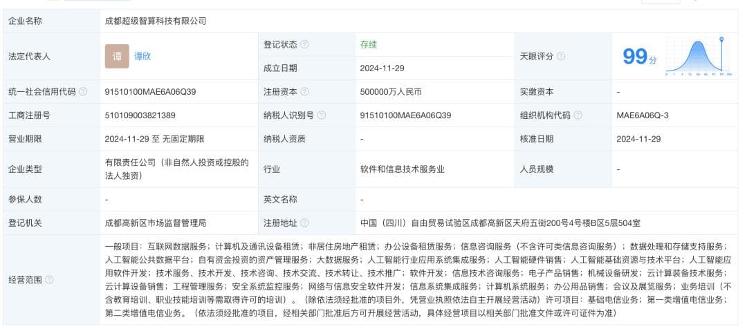 工商信息显示,成都超级智算科技有限公司(下称“超级智算公司”)近日成立,法定代表人为谭欣,注册资本高达50亿人民币。