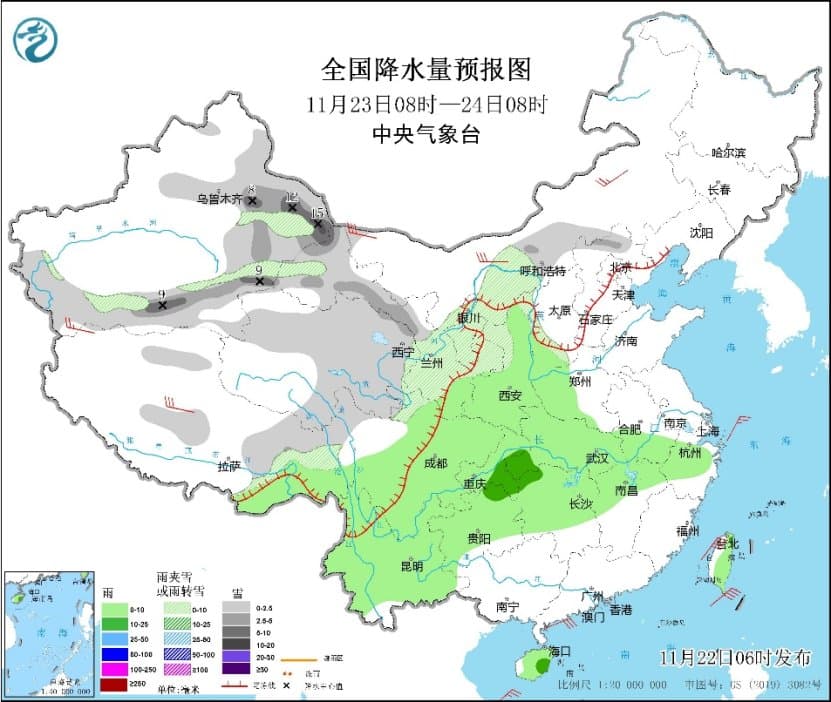 23日至24日,中东部地区降水范围较大,西北地区、内蒙古中东部、华北西部和北部、东北地区西部等地将有降雪、雨转雨夹雪或雪,其中,甘肃中东部、内蒙古中东部局地有大雪。