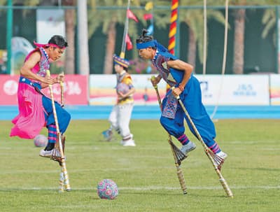 11月27日,湖北队选手表演竹马球。
