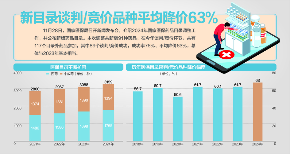 2024年医保目录调整后,目录内药品总数将增至3159种,其中西药1765种、中成药1394种。本次调整共新增91种药品,在今年谈判/竞价环节,共有117个目录外药品参加,其中89个谈判/竞价成功,成功率76%、平均降价63%,总体与2023年基本相当。