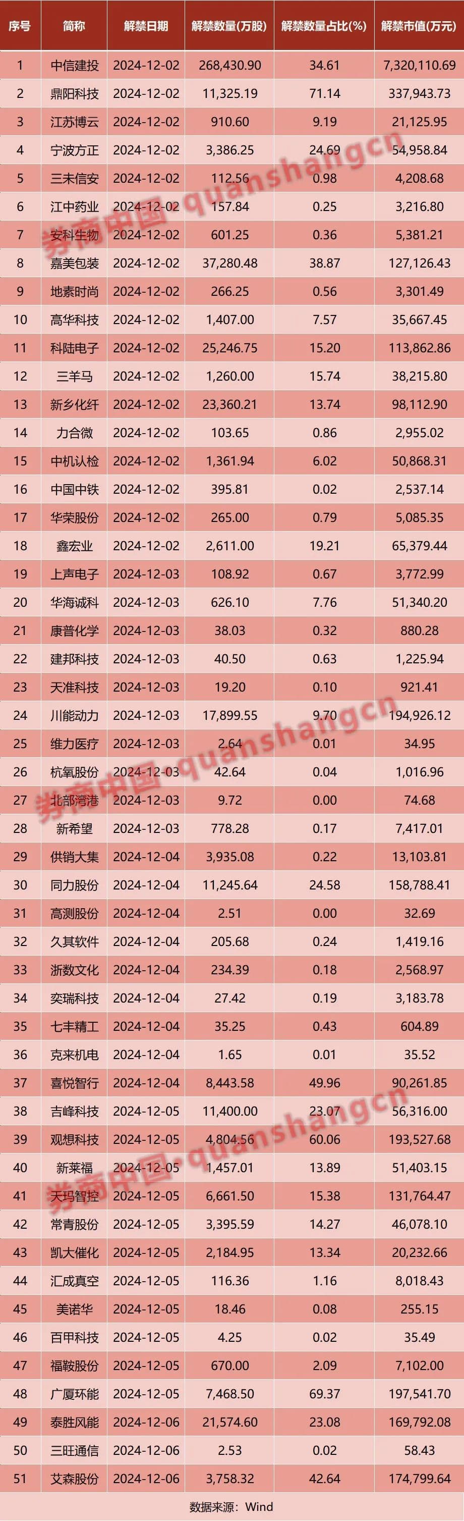 本周(12月2日至12月6日),A股市场将有51家上市公司迎来限售股解禁。以个股最新价计算,51家上市公司解禁股对应市值合计987.86亿元。从解禁规模上看,中信建投居首,解禁市值高达732.01亿元;鼎阳科技以33.79亿元的解禁市值排在第二。本周有19股解禁比例高于10%,具体来看,鼎阳科技、广厦环能、观想科技解禁比例排名前三,依次为71.14%、69.37%、60.06%。