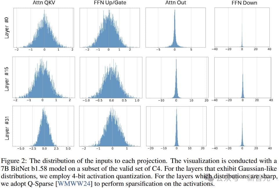 图2说明了模型大小为7B的BitNet b1.58中,每个模块输入的分布。