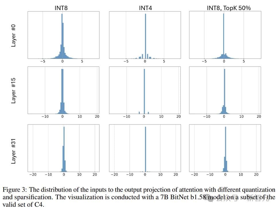 比如在7B模型中,BitNet a4.8的整体稀疏性达到了44.5%,只有3.4B的活跃参数。down projection层的输入显示出特别高的稀疏性,且中间状态分布以零为中心。