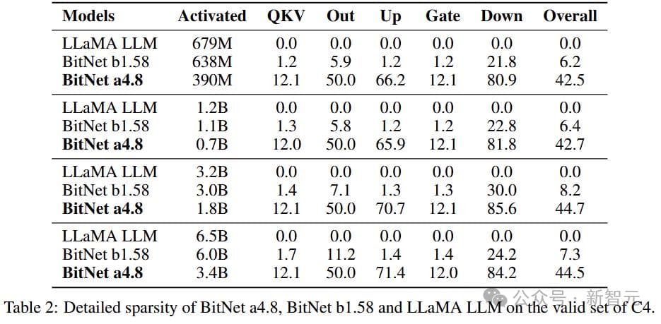表2展示了各种大小的BitNet a4.8、BitNet b1.58 和 FP16 LLaMA中每个模块的详细稀疏性(使用C4验证集上的非嵌入参数计算)。