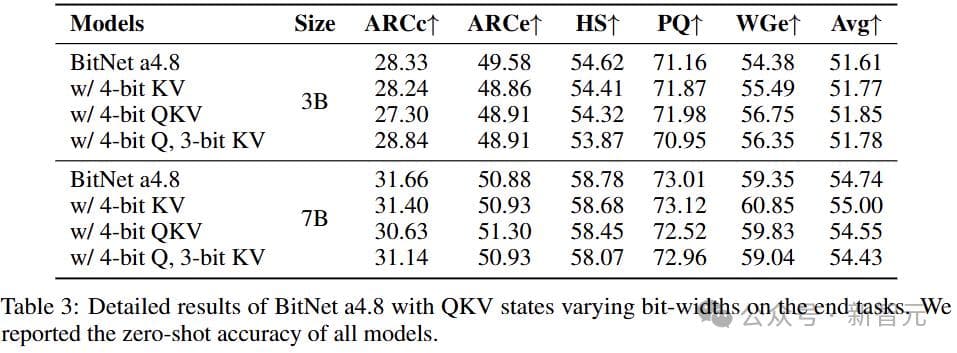 表3显示了BitNet a4.8在3B和7B模型大小下,low-bit attention的详细情况。模型使用4位KV或QKV头,精度损失可忽略不计,同时KV cache可以量化为3位整数。