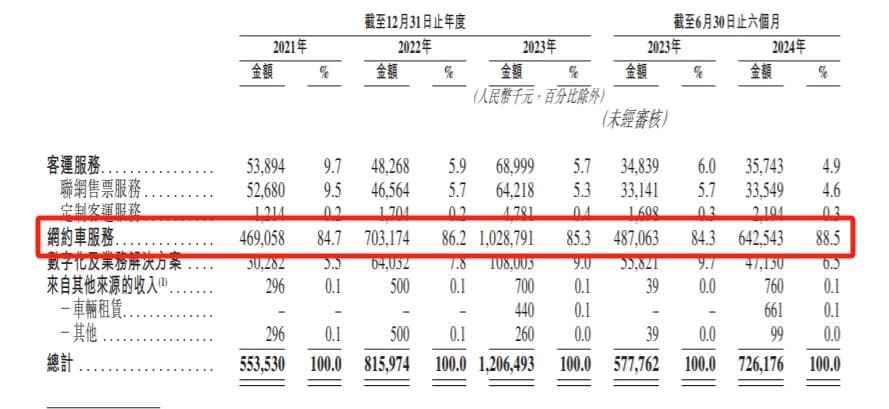 如今的盛威时代,与其说是客运公司,不如说是一家网约车公司。数据显示,2021年、2022年、2023年及2024年1-6月,公司收入分别为5.54亿元、8.16亿元、12.06亿元及7.26亿元,而网约车服务分别占比高达84.7%、86.2%、85.3%及88.5%。对比之下,客运服务业务收入却少得可怜,各期收入占总收入的比例仅9.7%、5.9%、5.7%及4.9%。