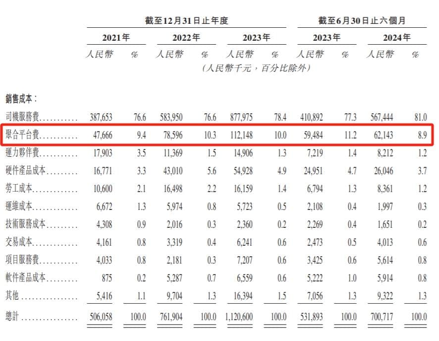 聚合平台服务费方面,高德等聚合平台在给盛威时代提供流量和订单的同时,盛威时代也要向这些平台付费。招股书显示,其聚合平台服务费从2021年的4776.6万元增加至2023年的1.12亿元,今年上半年则为6214.3万元。