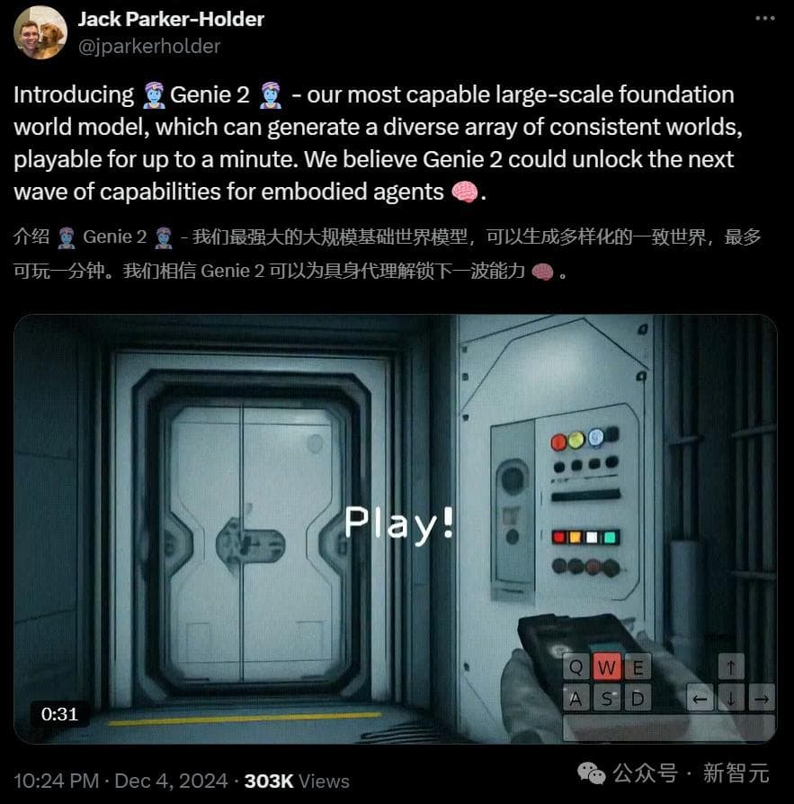 巧的是,Google DeepMind的研究员刚好在一个小时之前,分享了自家最强的「基础世界模型」Genie 2。