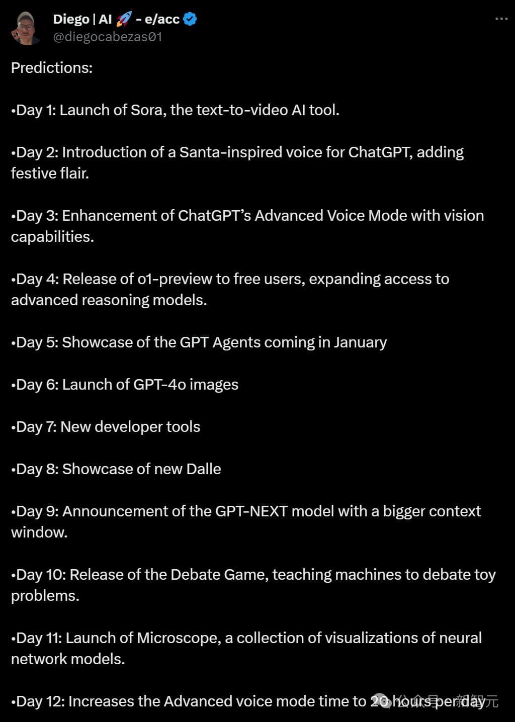 「从明天开始,我们将进行为期12天的OpenAI活动。接下来的12个工作日,每天发布一个新东西,要么做一个演示」。