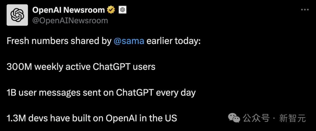 两年前,我们几乎没有任何业务。现在OpenAI的每周活跃用户超过3亿,用户每天向ChatGPT发送10亿条消息。