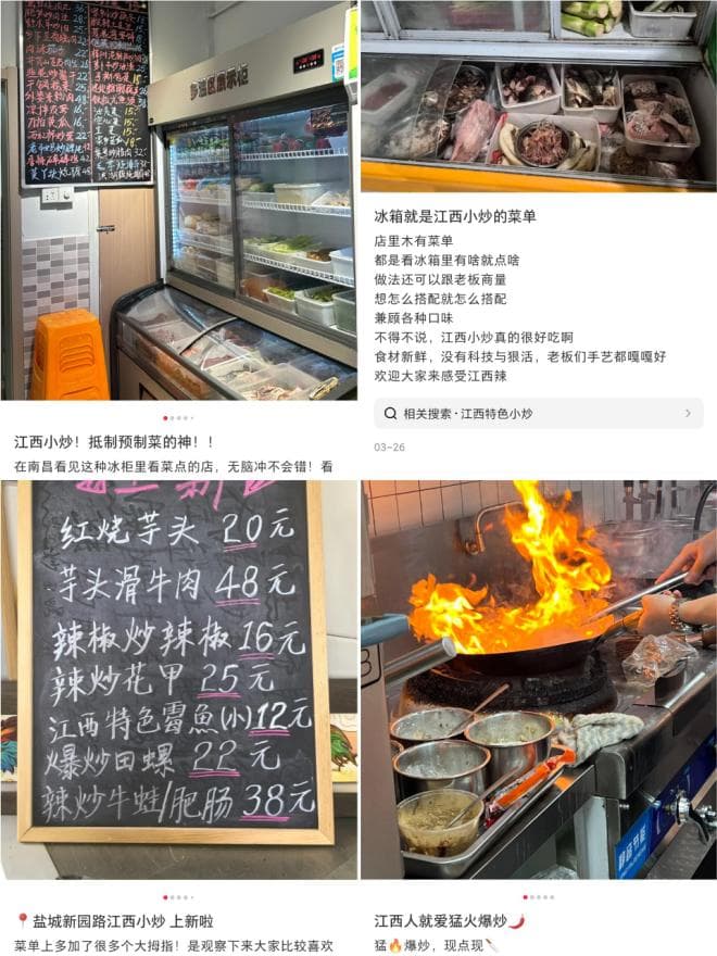 湘菜出圈不久后,江西小炒也紧跟其后走向大众视野。今年 4 月份,江西小炒成为网络热点,在全国悄然出圈,并在社交媒体上斩获了巨大曝光。在抖音上,相关话题的曝光量高达 2.8 亿;小红书上,关于它的笔记超过 1 万篇。