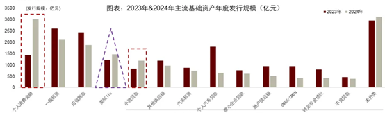 其他细分资产方面,根据中金公司研究团队的统计,2024年个人消费金融ABS与小微贷款ABS崛起。消金类ABS成为市场第一大发行品种,续发规模有支撑,且头部效应明显。小微类ABS政策环境较为宽松,资产供给方相对多元。车贷ABS发行下滑明显,需关注明年绿色车贷入池情况。