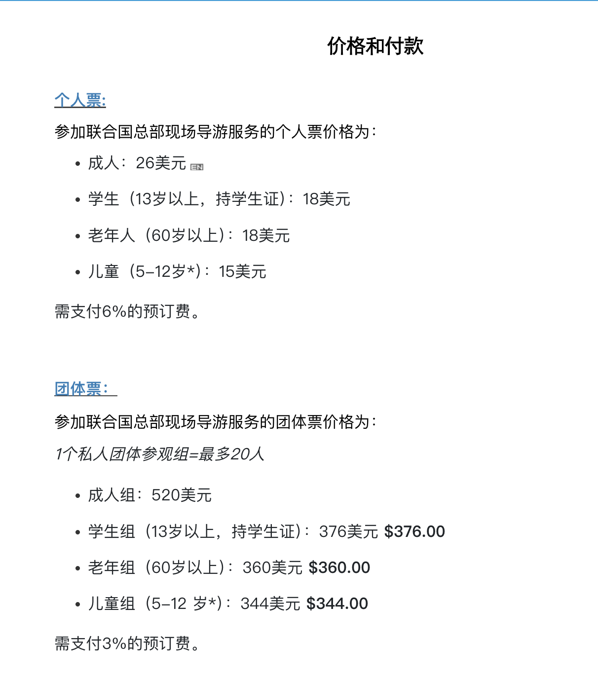 其中,联合国内部简报会每场需要20-25名参与者,价格165美元起,而如果只参加简报,不需要导游带领参观,则费用是250美元。
