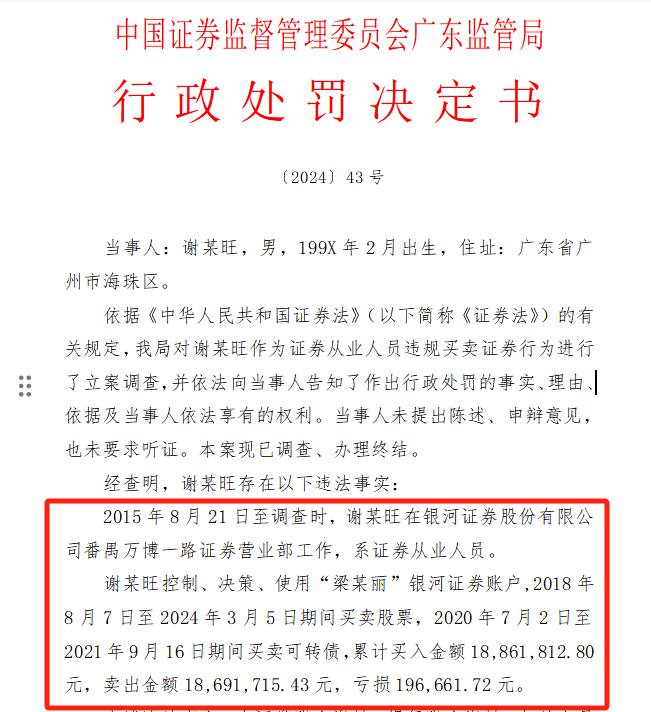 从罚单公布的“2015年8月21日至调查时,谢某旺在银河证券番禺某营业部”工作来推算,作为一名90后,意味着该名从业人员或从成为证券从业人员起,就有违规炒股的动作。