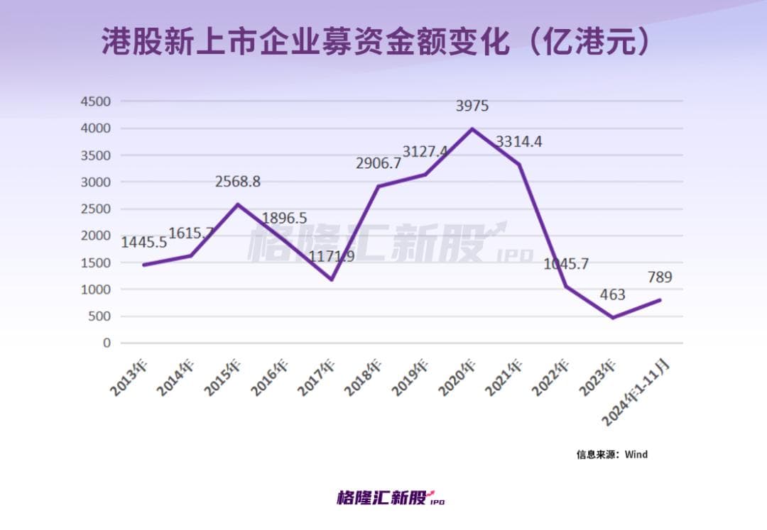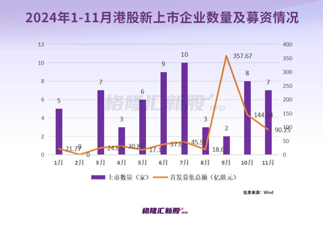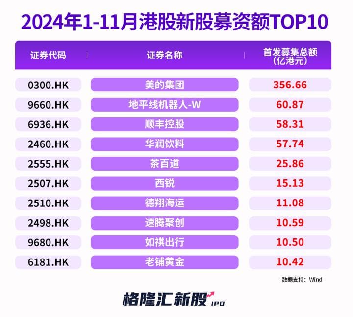 2024年前11个月,港股共60只新股IPO上市,首发募集资金累计约789亿港元。尽管上市新股数量不及2023年全年(70家),但得益于美的集团、地平线机器人、顺丰控股、华润饮料这些大型IPO的上市,今年港股前11个月的募资金额已超去年全年(463亿港元),可以看出今年香港IPO热度有所升温。