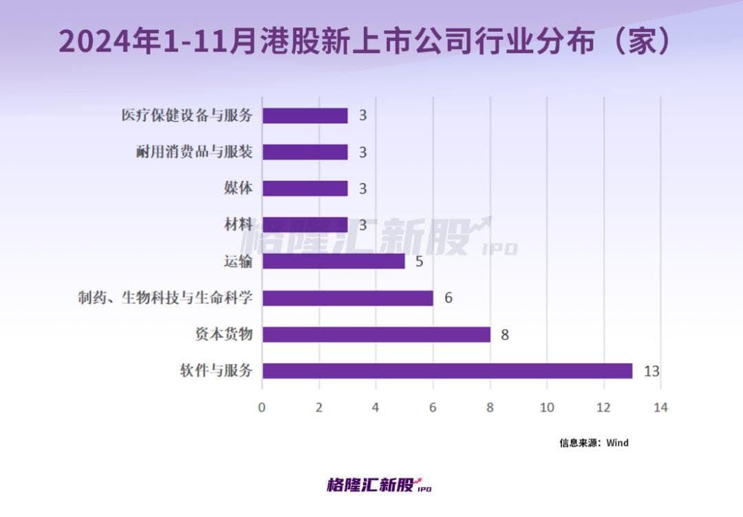 分行业来看,2024年1-11月在香港上市的60家企业中,来自软件与服务行业的最多,达到13家;同时有8家来自资本货物行业,包括集信国控、荣利营造、中深建业、天津建发等建筑工程领域企业;还有不少医药企业,包括华昊中天医药、同源康医药、荃信生物、盛禾生物、盛禾生物等。