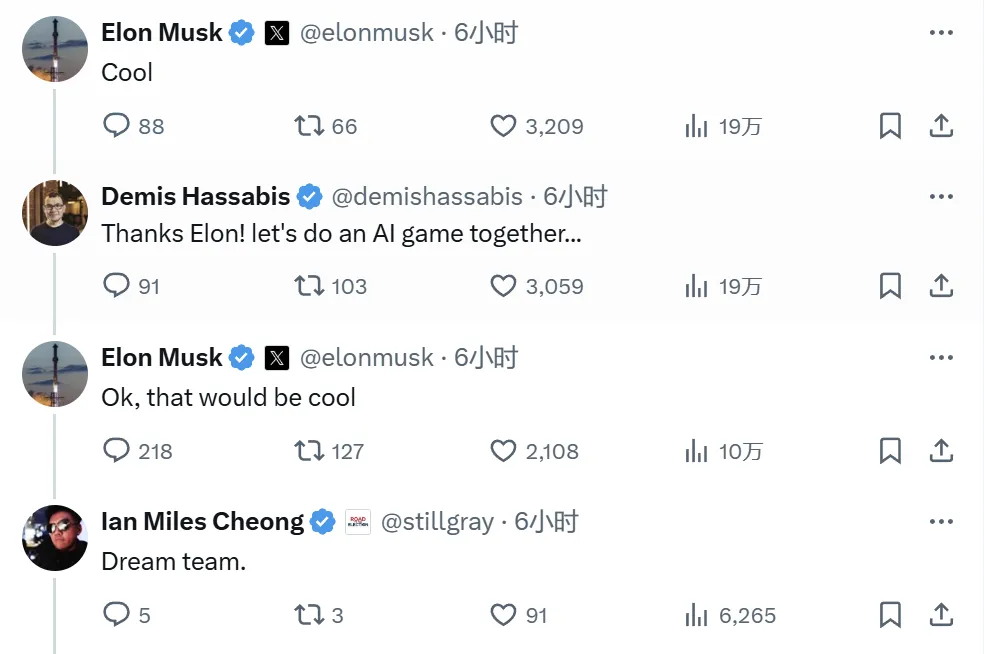 另外,一个细微区别是,World Labs将应用领域侧重于影视制作,而谷歌侧重于游戏制作。Genie 2发布后,DeepMind CEO Demis Hassabis直接邀请马斯克一起制作AI游戏,马斯克回复:Cool。马斯克此前声称,xAI将开办一家AI游戏工作室。