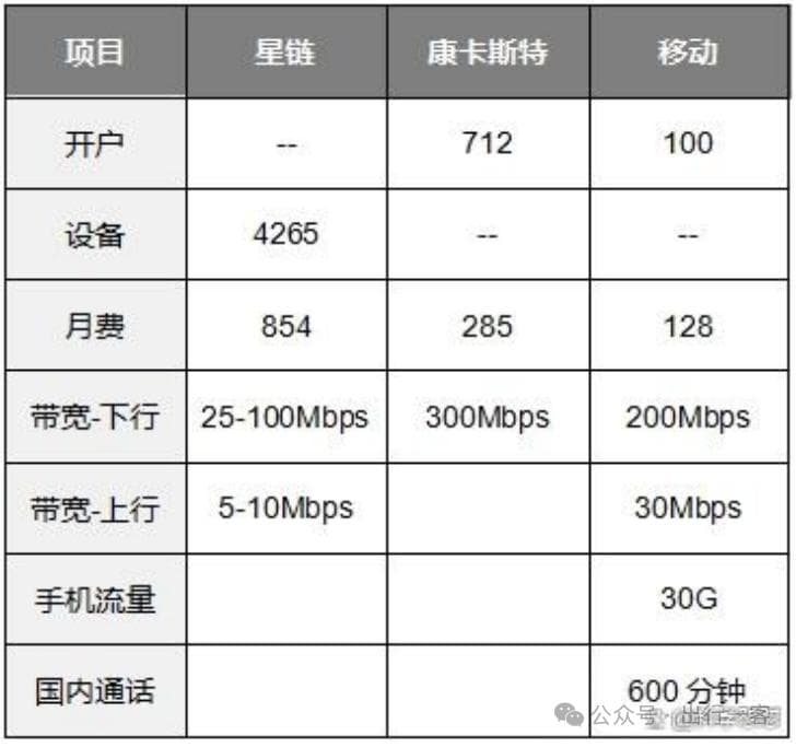 星链这么好,在中国难见其身影。而且对比中国移动等服务商,星链在价格上并没有优势。星链月费是移动宽带的8倍,购买接收设备需要额外花费4265元,相当于移动开户费用的42倍。