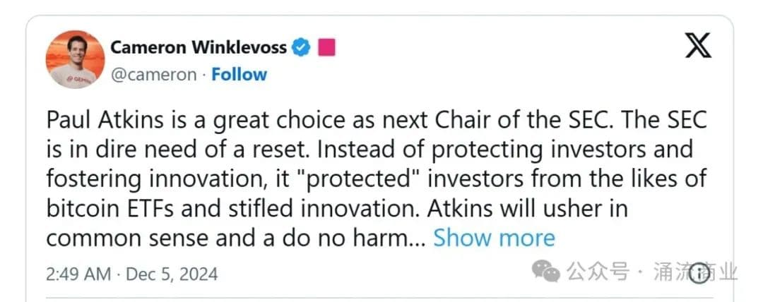 12月4日,加密货币倡导者保罗·阿特金斯(Paul Atkins)被提名为美国证券交易委员会(SEC)主席,推动了加密货币反弹。