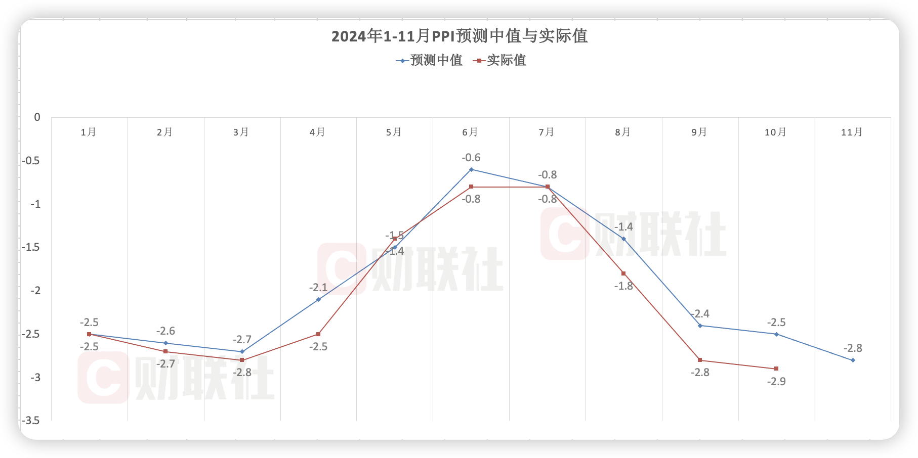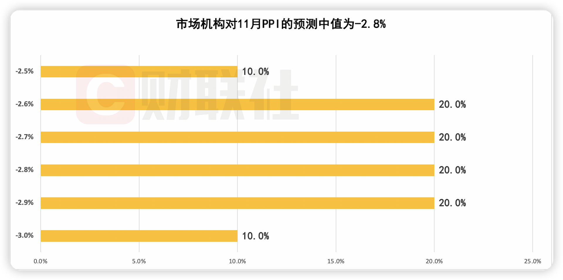 从PPI来看,10月PPI同比降幅扩大0.1个百分点至2.9%,为2023年12月来新低。本期调查显示,参与机构对11月PPI同比预测中值为-2.8%,降幅较10月环比有所收窄,预测区间为-3%至-2.5%。