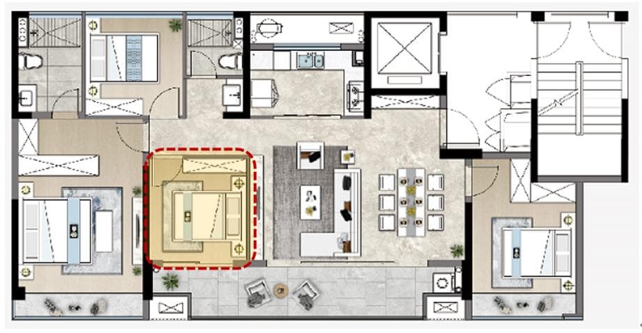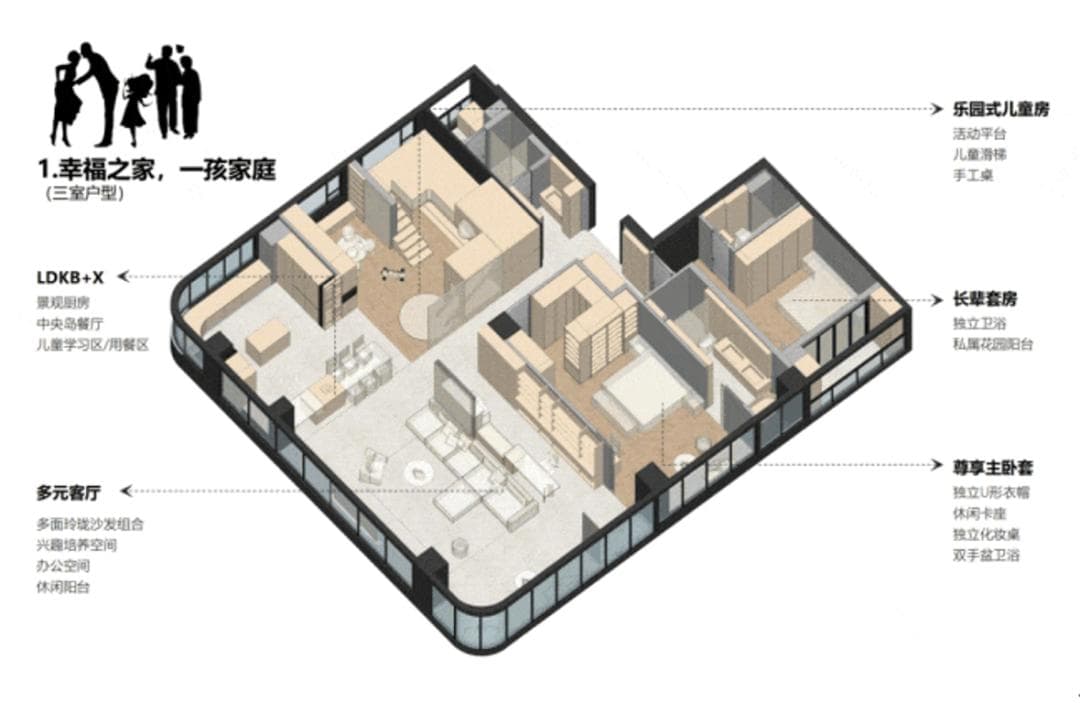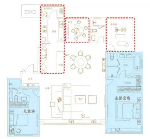 有房企就要求,儿童房按照能放下单人床+书桌+衣柜三件套预留,老人房按照能放下双人床+床头柜+衣柜的尺度预留,剩余的空间给到主卧和客厅,在保证次卧合理压缩的基础上保证主人空间合理放大,寻求空间更优解,保证一家人都能舒适生活。