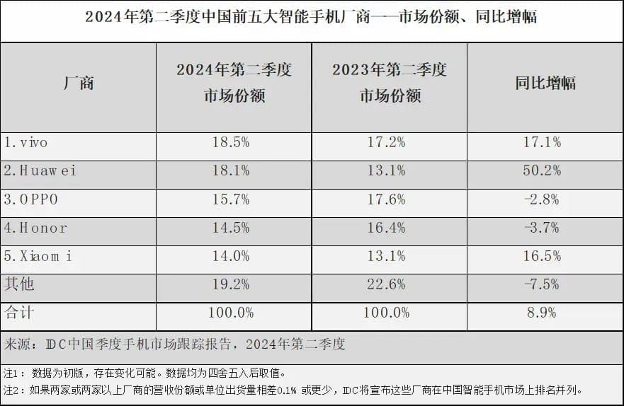 不过,第三季度,得益于iPhone16系列的发布,苹果又回到了前五的位置,市场份额为15.6%。