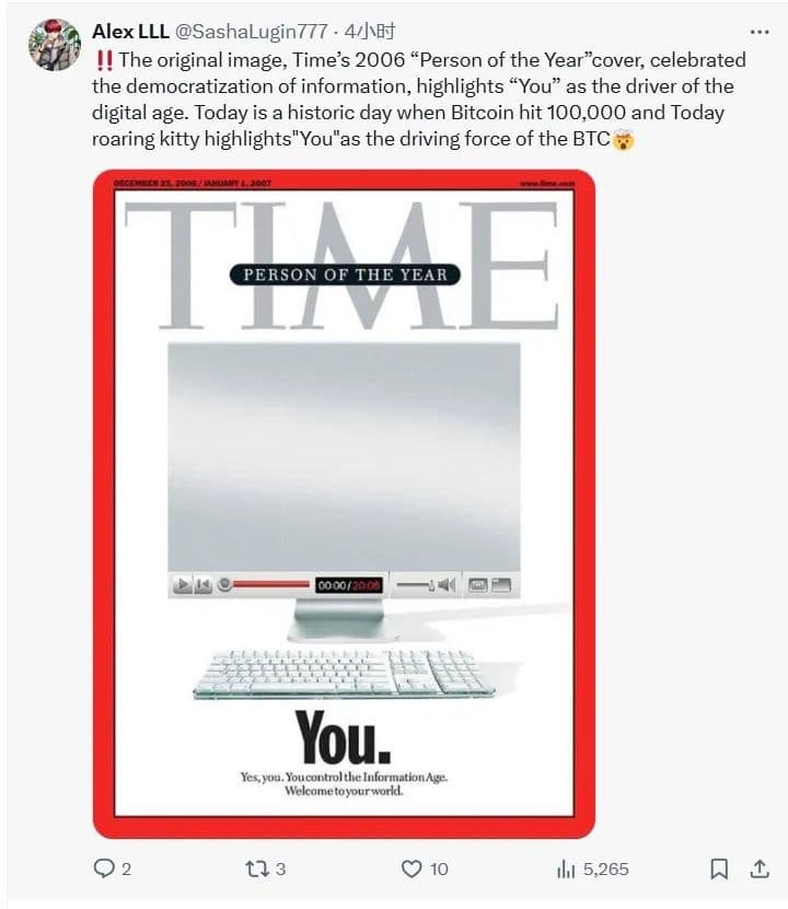 这位网友认为,这张图的重点含义是庆祝信息民主化,强调普罗大众是数字时代的推动者,而周四恰好是比特币达到10万美元的历史性一天,因此“咆哮小猫”想要表达,“你”正是比特币的推动者。