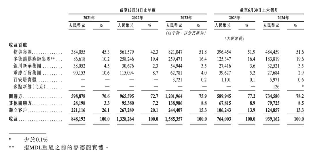 招股书显示,2021-2023年及2024年上半年(下称:报告期),多点来自前五大客户的收益占比分别为79.4%、83.3%、87.2%、89.6%。凭借在业务上的“互惠互利及互相依赖”,以及“基因血脉”上的深层次关联,物美集团和“物美系”的麦德龙供应链集团、银川新华集团、重庆百货集团,自然而然贡献了较多收益。