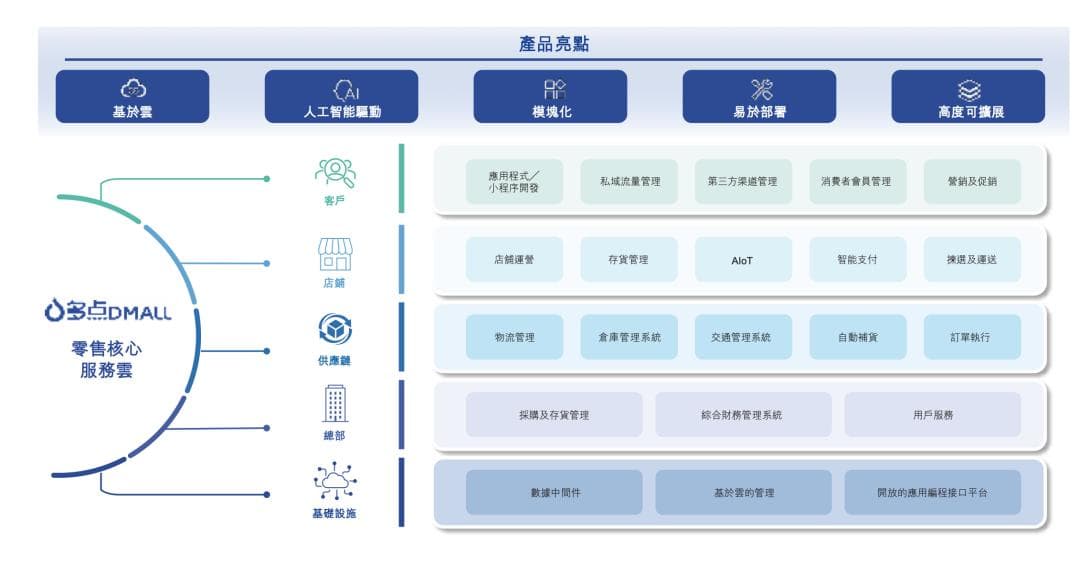 具体而言,在Dmall OS系统下 ,多点提供各种服务模组 ,帮助零售商将其运营的所有关键部分数字化 ,从采购、供应链及仓库管理,到产品陈列及店铺运营。