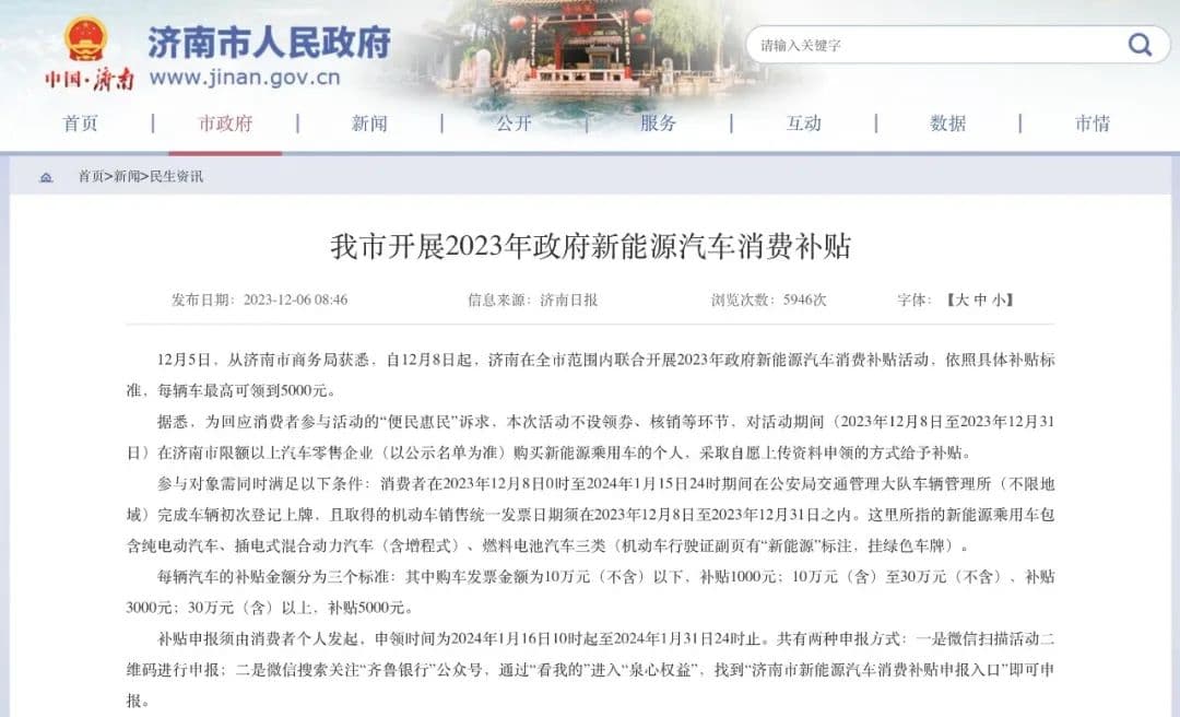 图/2023年济南市新能源车地方补贴政策 来源/济南市人民政府官网 新能源观截图
