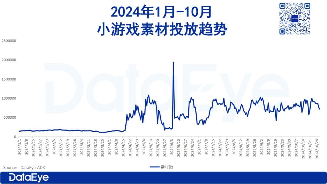 小游戏方面,DataEye-ADX数据显示,2024年1月-10月(抖音、微信小游戏加总)投放1.6亿(视频+图片)素材。在进入四月后,厂商加大投放量,到六月中旬达到顶峰。