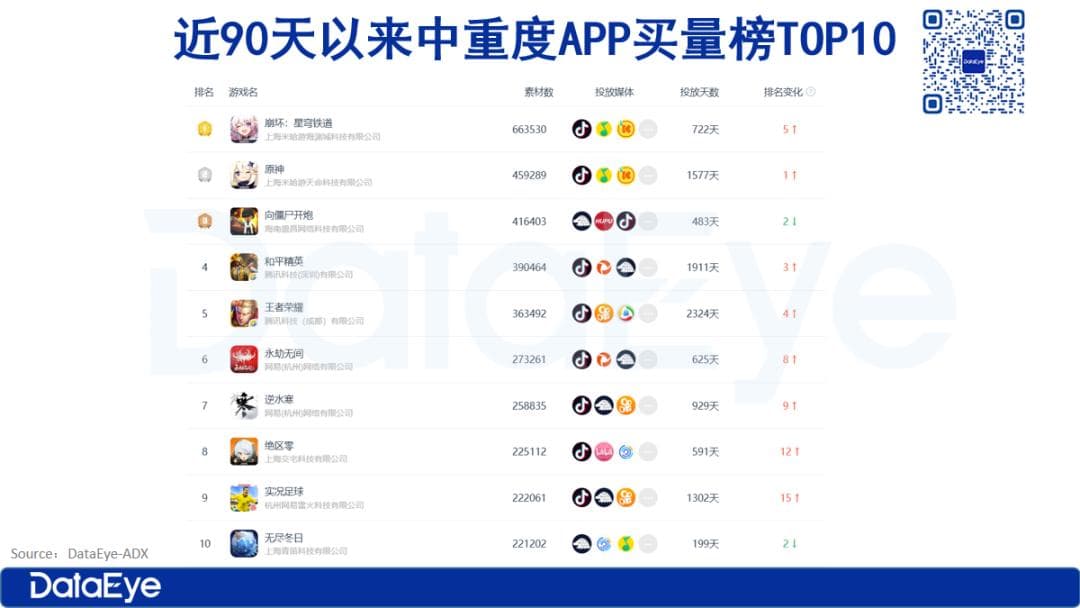 DataEye-ADX数据显示近90天以来,米哈游旗下的三款游戏进入榜单TOP10。除此之外,国庆期间,《原神》四周年将与万达电影合作,在全国万达影城开启「银幕绮旅 拾光之约」周年庆限时活动。