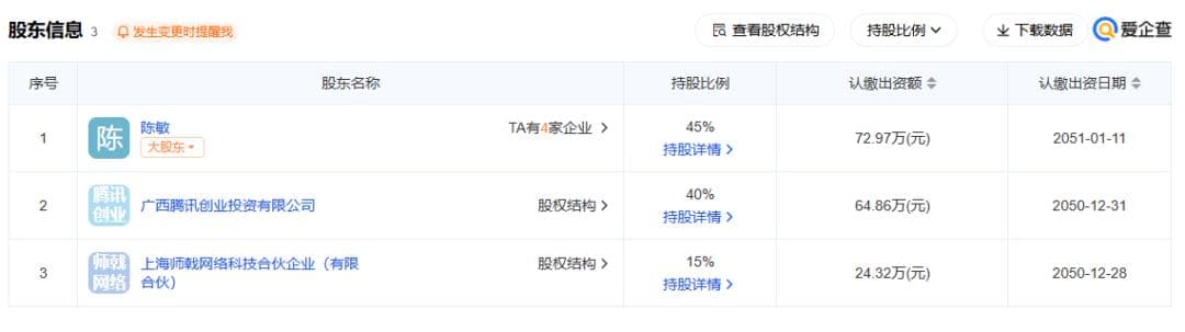 通过对相关企业信息网站进行进一步查询后不难发现,在这家公司的股东持股比例当中,腾讯方持股占比高达40%。