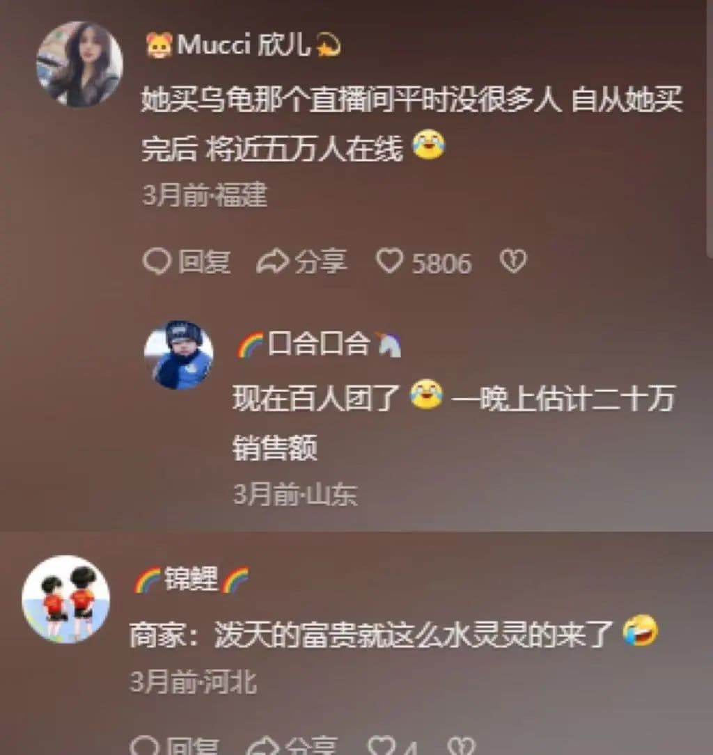 “ 她买乌龟那个直播间平时没很多人,自从她买完后,将近五万人在线 ”。