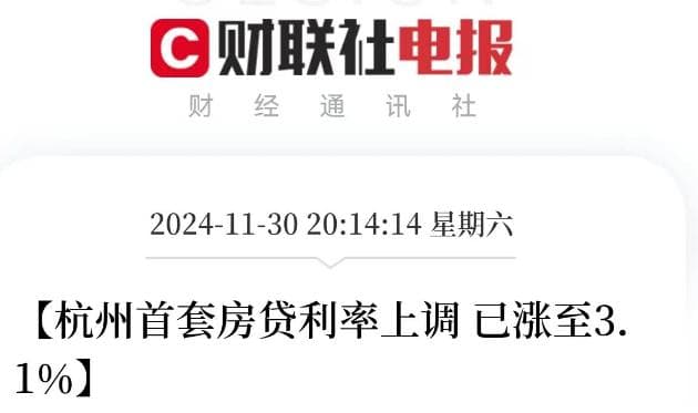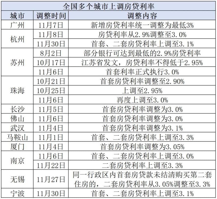 不过杭州2字头的时代只维持了半个多月,从11月8日起,杭州首套房贷利率从2.9%上调至3.0%,二套房贷利率与首套保持一致,随后11月30日,又再次调整到不低于3.1%。