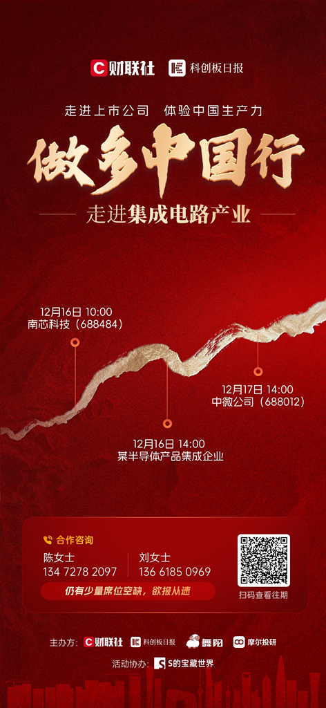 《科创板日报》12月9日讯 我国集成电路产业正在快速发展,产量和市场规模均呈现增长态势,国产化替代趋势显著,技术创新能力不断增强,且得到了国家政策的大力支持。全球范围内,集成电路产业也正迎来新的增长机遇。12月16日-17日,由财联社主办的《做多中国行》上市公司行项目组携手《科创板日报》将带领高净值投资者走进南芯科技、中微公司等3家集成电路产业上市公司,通过现场考察、与高管深入交流等方式,对公司业务布局、发展策略进行全面了解,尽请期待。