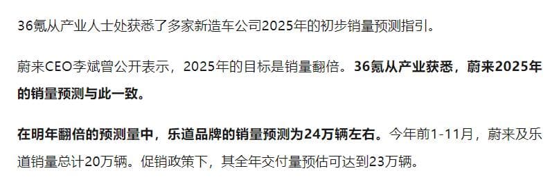 蔚来设定的目标看似很激进,但如果这一销量目标涵盖蔚来、乐道和萤火虫三个品牌的话,那么蔚来这一销量翻倍的目标就很保守了。按照规划,蔚来将在12月21日发布萤火虫品牌,作为品牌的入门级品牌,萤火虫拥有更明显的价格优势,对蔚来的销量提升会有一定帮助。相比之下,蔚来对乐道似乎更乐观一些,预计明年销量达到24万辆,与蔚来今年的年销量持平。