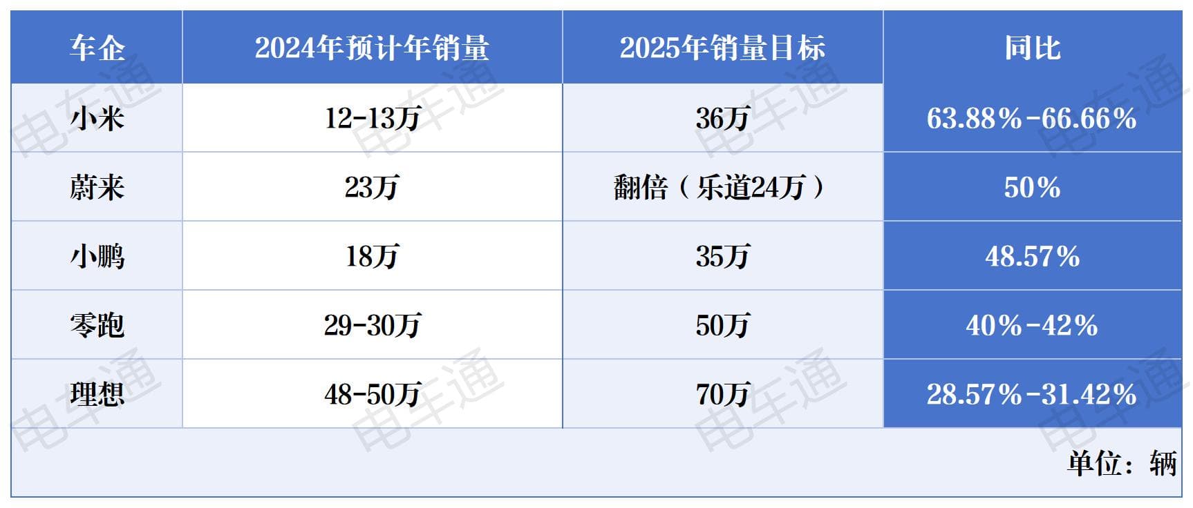 车企2025年销量目标曝光:蔚来理想变得保守,小米最激进