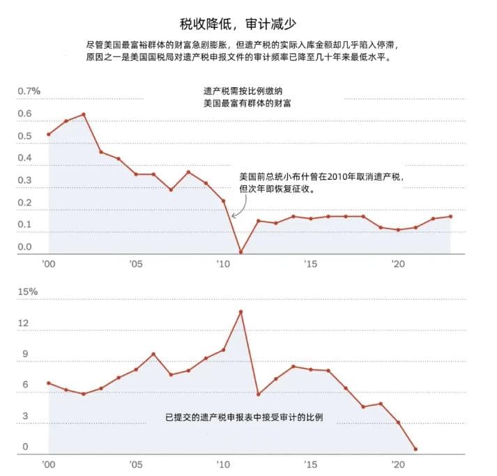 美国的遗产税设有高达40%的税率,但只有超过一定数额的遗产才会被征收。2023年,免税额度为2730万美元,超过这一数额的遗产才需要缴纳遗产税。然而,尽管美国最富有阶层的财富暴增,但遗产税的征收却并没有跟上财富的增长。