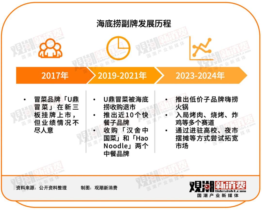 外部市场内卷严重,价格战不熄,内部经历错误扩张,海底捞可以说是正式步入了战略调整期。在这期间,海底捞尝试开放加盟,进驻下沉市场,实施了多种举措,副牌是其中较为重要的一环。