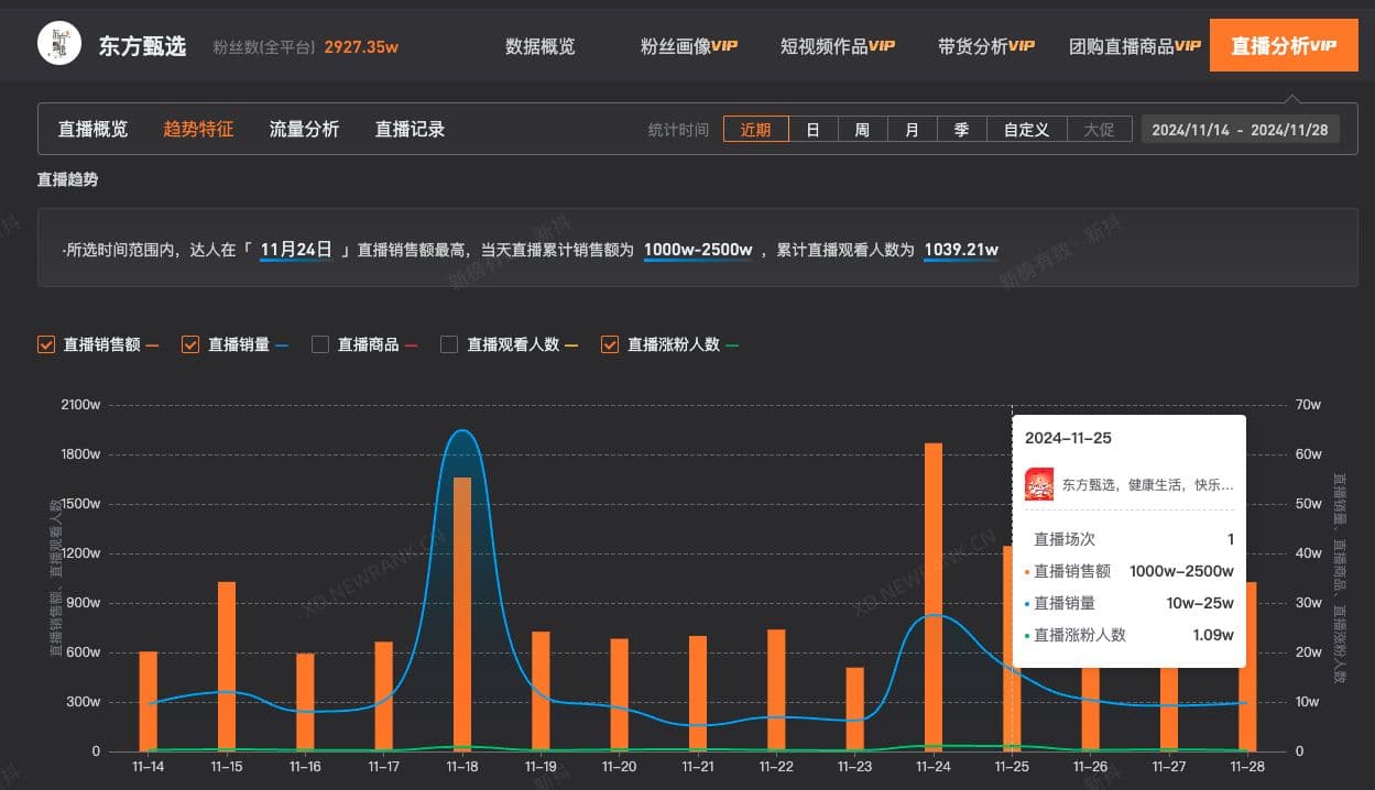 他的回归将东方甄选的单场GMV从百万元再拔回了千万元,也让24日、25日两日直播涨粉数再次破万,之后又难以激起流量池的大水花,趋于平静。