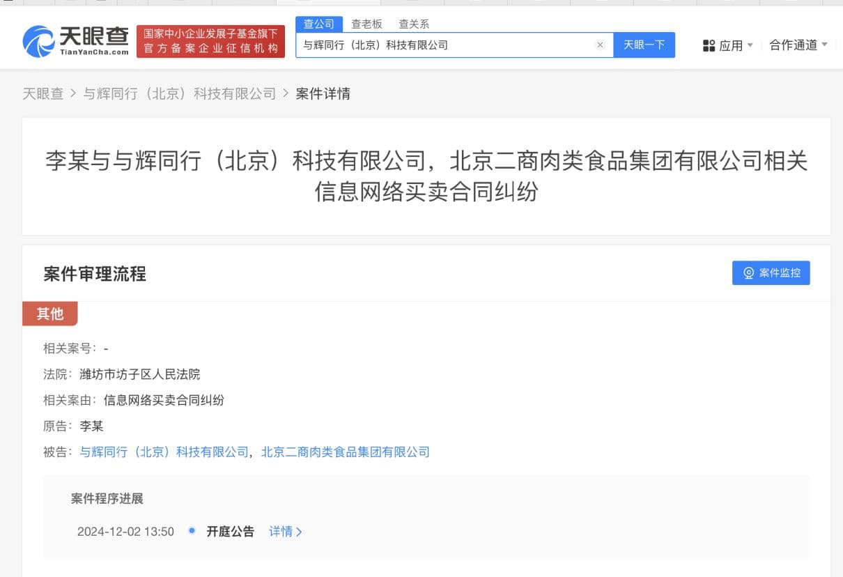 28日天眼查信息显示,与辉同行(北京)科技有限公司新增开庭公告,原告为李某,被告为与辉同行和北京二商肉类食品集团有限公司,因信息网络买卖合同纠纷案件新增开庭公告,该案将于12月2日在潍坊市坊子区人民法院开庭审理。
