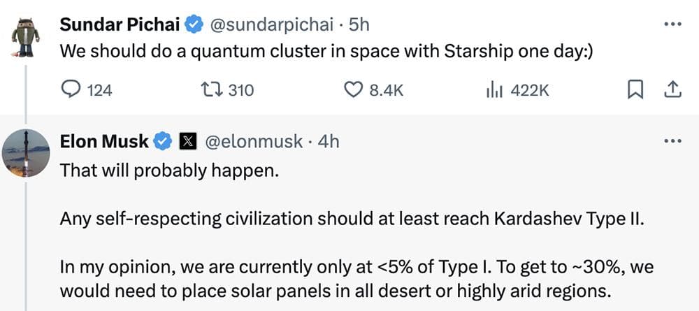 Alphabet及谷歌CEO皮查伊发文官宣这项重磅进展后,马斯克立即评论“Wow”。俩人还在评论区热聊起来,皮查伊建议有朝一日用SpaceX的星舰在太空里建个量子集群,马斯克则回应“这很可能会发生”。