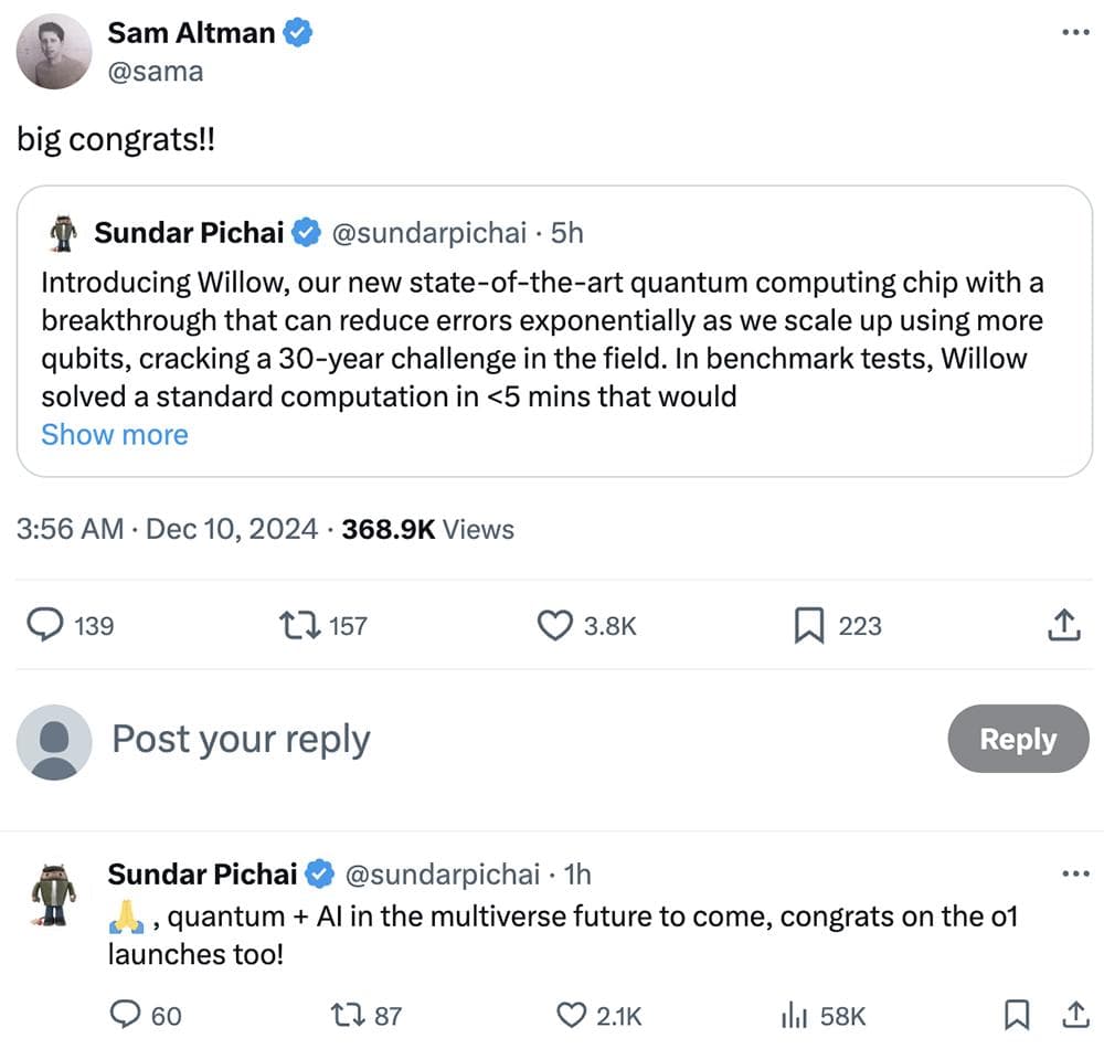 连刚发布Sora视频大模型新品的OpenAI联合创始人兼CEO萨姆·阿尔特曼都抽空道喜:“大大的祝贺!!”皮查伊回礼道:“多元宇宙未来的量子+AI即将到来,也恭喜o1发布!”