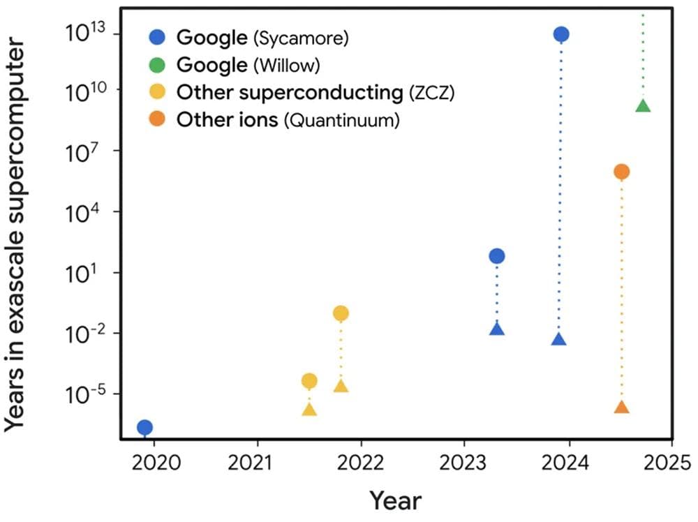 Willow在这项基准测试中的表现令人惊叹:不到5分钟的时间内完成了一项计算,而当今最快的超级计算机之一需要10^25年才能完成。